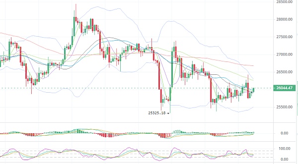 技术结构四小时图来看布林带收口状态运行,币价在小幅度拉升后收大阴线调整,目前三连阳上行有效企稳中轨上方,MACD双线交叉粘合后开口向上,多头能量柱有列排序,KDJ三线向上有走金叉的概率。K线上来看,短期币价低点在上移。下方筑底于25300一线,前面文章也说过下方25300或成为强力支撑,所以我们在25600-25200区间布局了多单进场。综合所述,操作上我们还是建议低多为主。短期上方关注26800一线压制。首次触及该点位可以小止损进场做空看一波回落。止损27000上方 目标看400-600点, 空仓的币友下方可以在26700附近开多单底仓进场 ,预留下方补仓位置即可。更多实时点位可以添加九哥微:ada19161