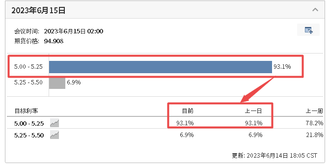 市场交易员的交易预期来看,依旧维持6月份加息的概率为6.9%,也就是说6.15号的议息会议维持目前利率水平,不再加息,来自加息的压力退去了;