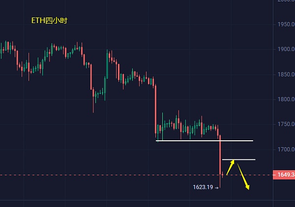 以太坊:任何一轮长时间的震荡行情,想要打破瓶颈,最有效的办法就是借助外力的推动,而这个外力就是技术面以外的消息数据面,凌晨的利率决议很好扮演了这个角色,虽然本周CPI没有激起浪花,但利率决议后以太坊成功跌破日线关键支撑1700-1720破位下行,刷新近三个月以来新低的同时,也打破了持续了一个月的震荡结构,底部支撑的失守,意味着短期内的行情下行延续,日线下一支撑处于1500关口一线,但是由于这段时间整体行情的波动也不算大,所以走势上依然会走的比较着急,不够顺畅;不过既然破位支撑位,那么接下来自然看空做空为主。