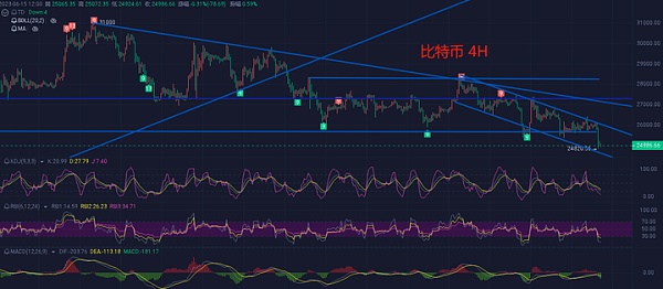 从四小时图来看,运行通道形成向上持续打开的状态,多头量能排列有序,中轨支撑没有回探的迹象,价格逐步走高,均线没有拐头的需求,小周期保持震荡上行走高的状态,目前币价在25040附近运行,macd放量运行双线死叉向下指引,ma均线向下指引,目前行情虽然止跌但反弹力度偏弱,预计短期将持续震荡修复,相对于日线的结构上目前还并未到底,行情有再次去确认下方支撑的迹象。没有出现明显的拐头,那么还是要防范行情的走低预期。