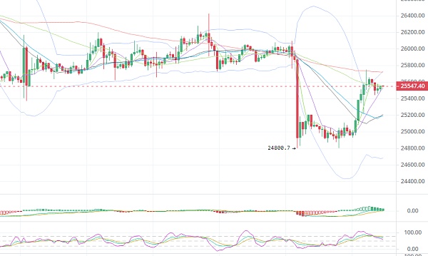 技术结构来看,日线级别中,价格连续大阴下放,都未有较大的收复,运行通道形成向下开口的状态,空头能量实体排列,均线向下延续走低,虽有一定的迂回效果,但并没有出现明显的反转,四小时级别线中,价格跳水后弱势修复继续向下突破,运行通道保持向下张开的状态,目前空头量能缩量,均线粘合缓慢拐头,小周期有一定的修复延续需求,但力度并没有表现强势,短线上冲高回调呈现疲软状态,明显的修复受阻,对于接下来个人还是看好空头的进一步延续,小时线来看连阳上行,在触及上方25800压力位后开始回撤,由此可见上方压力的强劲。目前布林带正在走缩口,短期内又会是一个震荡的行情。kdj三线在昨晚上涨过程中影线开始上扬,随后在早间回撤后开始交叉下行,从这里可以看出,短期内行情会有一笔小的回撤,等这波回撤吃下后我们在进行低位多。
