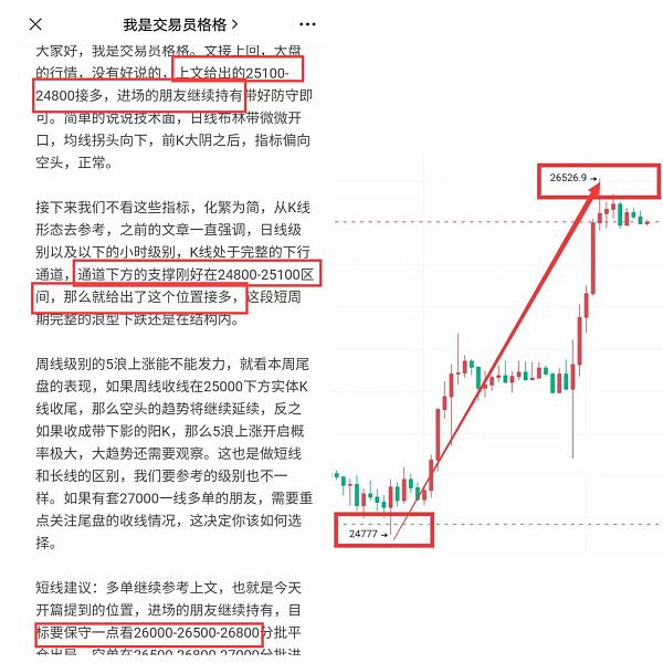 大家好,我是交易员格格。文接上回,提示大饼25100-24800多单进场的朋友持有看目标,日内凌晨完美到达目标26500一线,跟上多单策略的朋友收米1500刀左右。