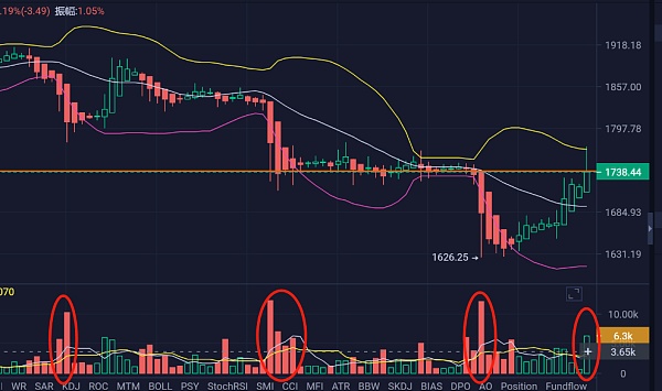 当前4小时布林带走势中价格触顶上轨1775附近承压回落,K线收出上影下吊阳线,反弹局部时段呈现势衰迹象。