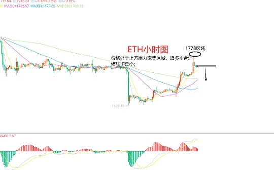 6月17日以太坊(ETH)合约技术面分析:今日方面,大周期日线级别昨日报收中阳,K线形态上出现连阳上涨形态,价格价格还是在均线下方,当前得反抽只是价格回归了均线位置,附图指标死叉向下,加上时间在周末,那么主要关注价格得反抽破高和趋势得预期都要在下周了;短周期小时图昨日得反弹是刺破了前期得开跌口位置,周末能否站稳还需要在关注,早间价格冲高后承压回撤,当前K线形态连阴,但也看不出力度来,所以今日交易还是以空为主,但目标利润不能看大了,因此今日ETH短线合约交易策略:市价1750区域空,止损放在1780区域,目标看1700-1680区域;