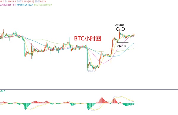 6月18日比特币(BTC)合约技术面分析:今日方面,大周期日线级别昨日报收小阳线,K线形态上连阳反弹,但价格在没有突破前期高点之前还是有回撤的风险,另外,在周线级别K线形态连阴单阳,价格运行均线下方,附图指标死叉向下,那么还是思路不变,下周我们还是要看回车下跌的,周末依旧是修正对待。短周期小时图高点位置在26900区域,低点在26200区域,而昨日整体价格维持小幅震荡走势,当前也没有太多的可操作空间,因此今日BTC短线合约交易策略:反抽26800区域空,回撤26200区域多,在高空低多的操作同时关注向上或者向下的破位情况再做调整。