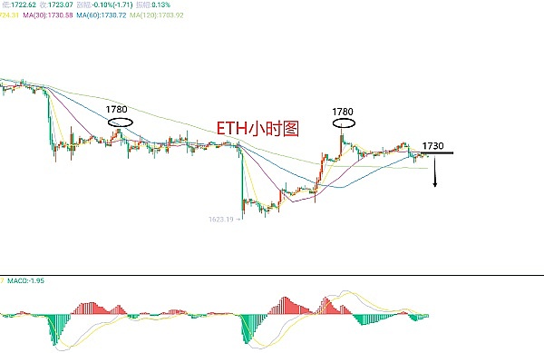 6月19日以太坊(ETH)合约技术面分析:今日方面,大周期日线级别昨日报收小阴线,K线形态上在连阳上涨承压于1780区域后首次出现收阴回撤,价格低位震荡,均线关键支撑位置再1711区域,向下破位的话会有续跌出现,不破位今日还是震荡局面;短周期小时图周末震荡价格不破高不破低,当前依旧处于横盘状态,但四小时图均线阻力位置1730区域,附图指标多头动能缩量,快慢线有死叉迹象,因此今日ETH短线合约交易策略:反抽1730区域空,止损1751区域,目标看1680-1660区域;