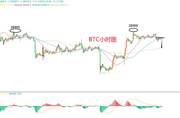 6月19日比特币(BTC)合约技术面分析:今日方面,大周期日线级别昨日报收小阴线,整体波动不大,毕竟是在周末,但也给我们一个信号,承压高点位置26900区域附近已经是冲高二次承压回撤位置,那么阻力还是比较强的,再加上大周期的走势趋势综合来看,此位置就是防守位置;短周期小时图周末连续的震荡下跌走势,却没有破位上周五的回撤修正低点位置,所以说弱势趋势还是不明显,但是四小时图当前死叉,均线阻力位置再26500区域,因此今日BTC短线合约交易策略:反抽26500-26550区域空,止损26900区域,目标看25800-25600区域;