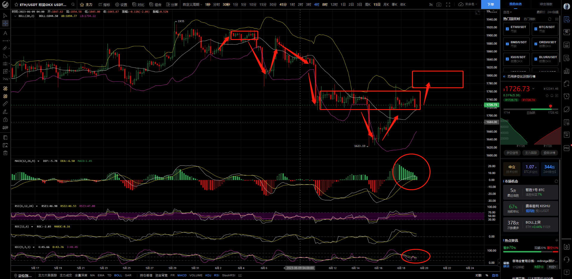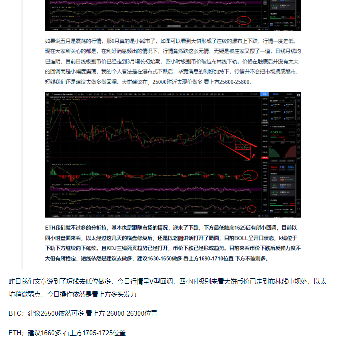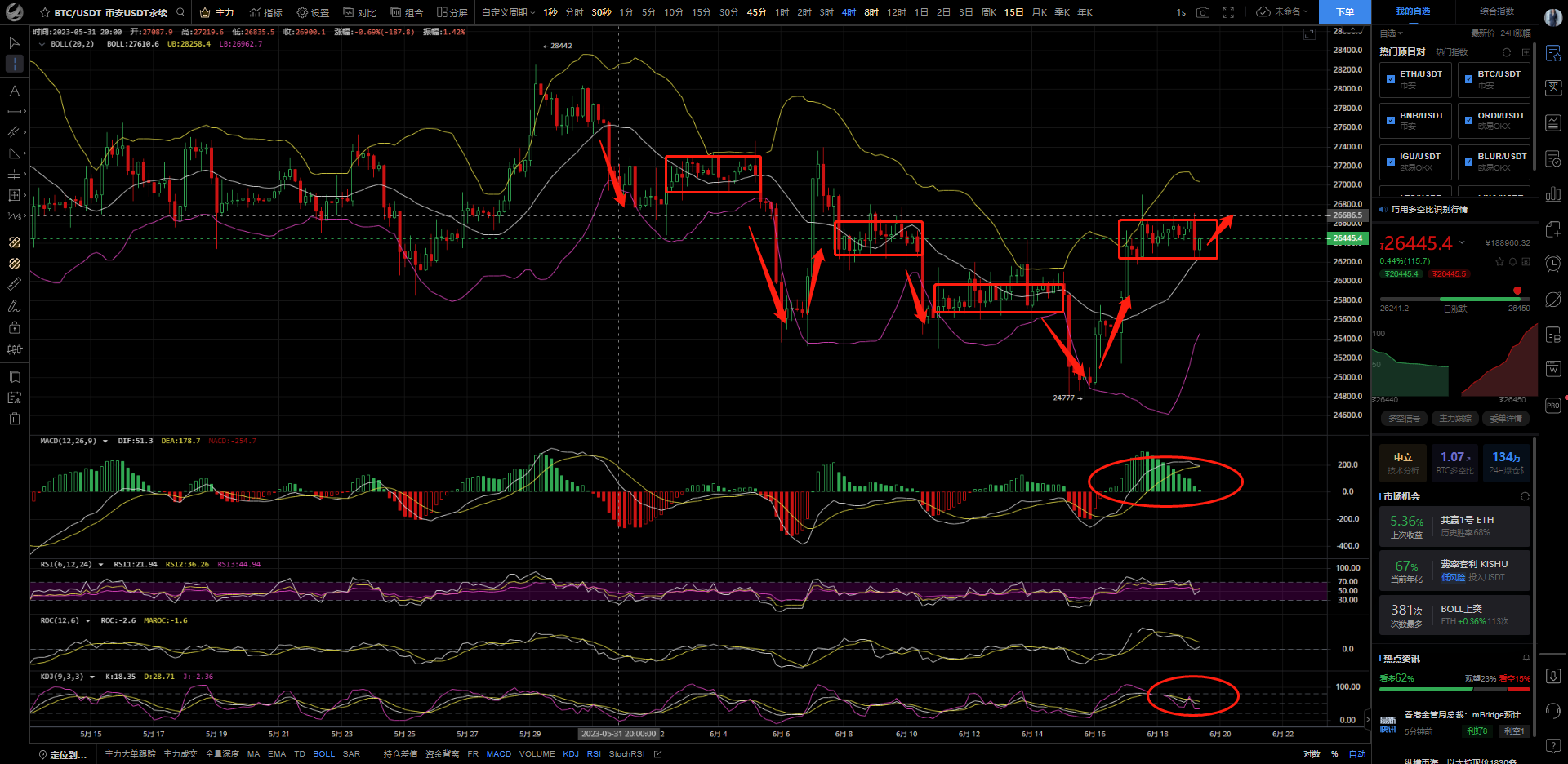 6月已过了一大半,本月的走势相信让大家也是非常的头疼,整体是呈一个小熊市的下跌,且”多次瀑布式下跌后进行长时间的来回区间的震荡,并形成了多次阶梯式的下跌走势大饼6月最高触顶27400左右,最低触底24777,以太坊最高触顶1915,最低触底1623,最让人难受的是在众多利好消息加持下,行情反向走低,且形成了2次V型多空来回造成多人爆仓,难以判断方向,消息面美国5月季调后CPI月率0.1%,预期0.20%,前值0.40%,美国5月未季调CPI年率4%,预期4.10%,前值4.90%。美国5月未季调CPI年率录得4%,连续第11次下降,创2021年3月以来新低。 美国CPI数据公布后,现货黄金短线下挫后上涨,CPI数据降幅超出市场预期,但它们本可以更低,因为目前的数据仍然高于平均水平。也是给美联储停止加息带来了肯定,凌晨美联储宣布本次会议不加息,维持联邦基金利率目标区间在5%至5.25%,这是美联储自去年3月以来累计加息十次后首次暂停加息,但行情大家是有目共睹的,币价在美联储发布不加息利好消息后,凌晨迎来了全面的瀑布上下跌,主流币BTC最低触底24796,ETH最低触底1625,价格均已触底3月多头行情增长以来最低点位,在币价跌破也发文章和大家讲了,币价会再次拉升呈一个来回走势,今年的走势大多是一个震荡行情,来来回回,目前币价均在触底后拉升,并维持下跌后第三阶段震荡,后续如何操作我们看图聊一下。过去的已过去,对后续的判断才是关键。