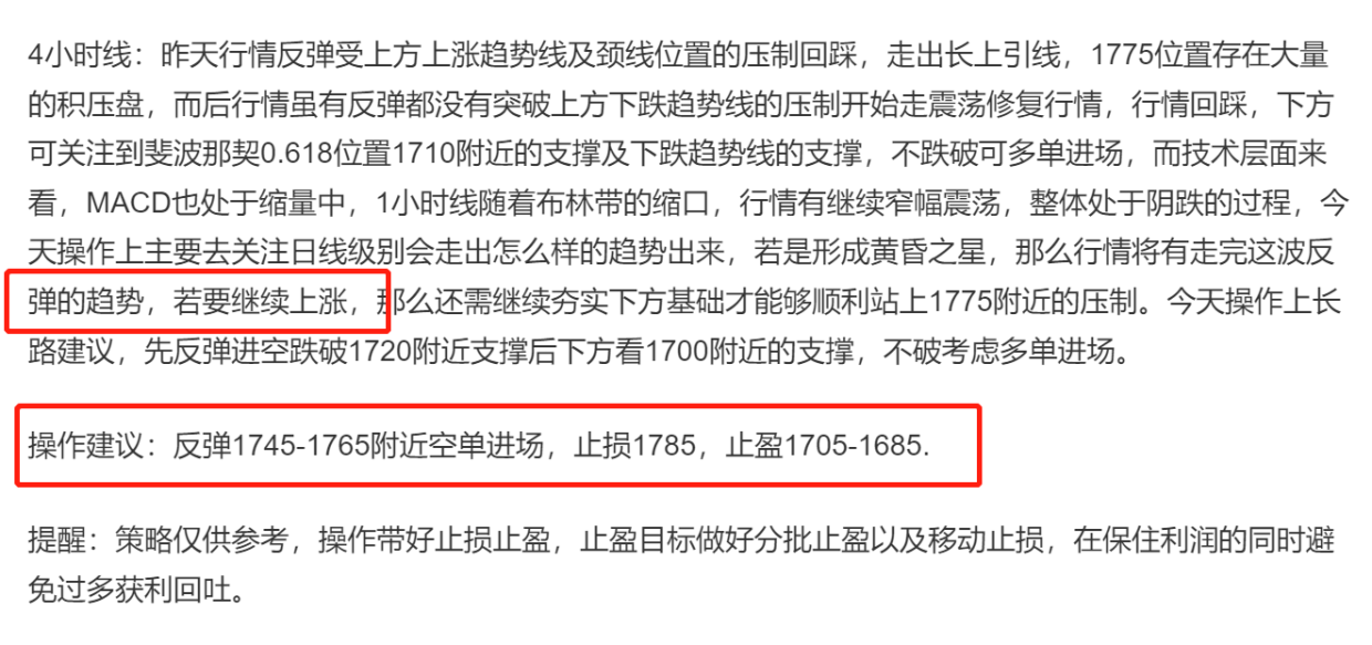 操作建议:反弹1740-1760附近空单进场,止损1780,止盈1710-1690.