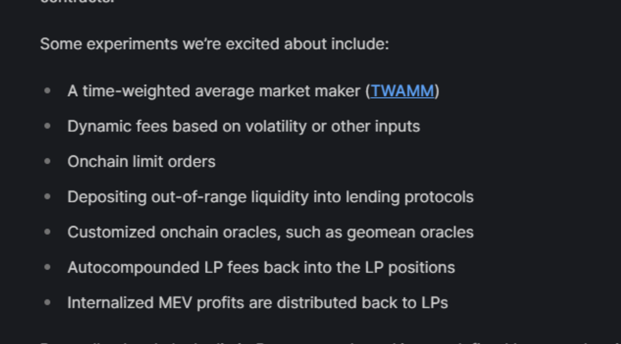 简单来说cex中的限价挂单以及在设置时间内的挂单都可以在hooks上实现。通过官方公布的github来看可以做到在开始交易前设置限价,如果在交易过程中满足条件则完成交易,不满足则取消。对于大额订单可以设置一段时间内的分批挂单买卖,等同于在cex挂买卖单低买高卖的波段操作。