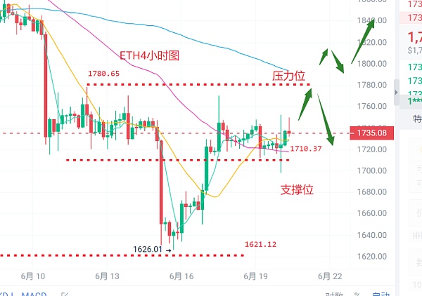 以太坊昨日高点1750附近,低点1700附近,以太反弹的力度较弱,经过V字行情后,目前重回前期的箱体中,短线进入横盘调整中,上方关注1780的承压,若能有效站上就有机会去上攻1900.