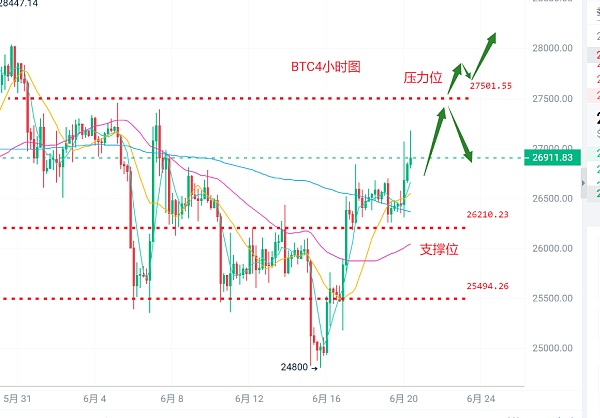 大饼昨日高点27070附近,低点26250附近。在上周受鲍威尔讲话影响大饼走出一波快速下跌,随后开始技术性反弹修复,走出V字型,从大周期上看大饼仍然处在下降趋势中,短线进入反弹中,目前处在下降趋势线附近,短线关注27500能否有效站上,若能有效站上行情才有可能反转。