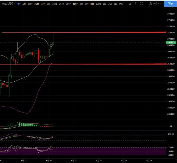 昨日大饼行情横着不动,凌晨早间直接拉升,币价终于回暖,和预测一样,昨日文章也说过会涨,果不其然直到午夜才有区间走出,多空来回拉锯,先走反弹再走弱,早间又强势反弹,区间给的也不算小,在此期间有多,有空,今日早间直接到27000,一切都是那么顺畅,直接拉升到27000上方,不过在27000并没有直接站稳,反而是上冲之后就引发了回落,不过不用担心,此波小幅回落仅仅是上冲过后的正常回落,日内个人觉得还得继续看涨!虽然昨日文章的操作建议大饼低多没有接到,但是以太低多还是稳稳的接住。稳稳吃了40点下车。由此可见多头动能还是较为强势的,短期行情没有给到一个反转的信号,个人预计后期还是会继续向上拉升看到28000应该是较为容易的 。废话不多说了,咱们看看今日盘面走势情况。