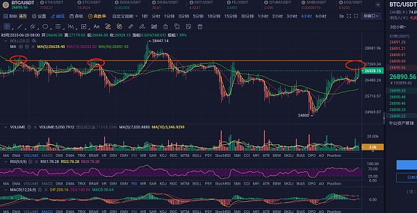 RSI方面还是强势跨过70值且呈现上开口角度,当前介于超买区前凑或多头强势走出两个方面因素都具备。至于会以那种方式展开还需后续进一步确认。超买区无疑就是短线见顶改走回调,如果是多头强势走出,那上方27500阻力位将会被很短时间一笔带过。MACD方面快慢线0轴上方反复纠缠上行,K线也连续震荡上扬,当前双线交叉角度加大张开。 短线走势会加大振幅。盘面会显得相对往日活跃起来