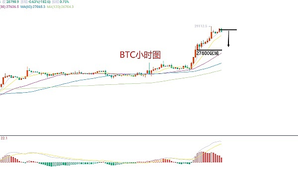 6月21日比特币(BTC)合约技术面分析:今日方面,大周期日线级别昨日报收大阳线,K线形态连阳上涨,价格运行于均线上方,附图指标金叉运行,而价格回归均线支撑位置咋27400区域,当前整体走势表现很强势,但大多是消息面的影响上涨,所以也需要关注价格回撤均线修正的走势;短周期小时图起涨点位置在26700区域,凌晨后开始发力今日早间延续,当前K线形态连阳,附图指标金叉运行,但注意四小时和日线当前价格偏离了均线,价格处于高位震荡,所以还是不建议直接去多的;因此今日BTC短线合约交易策略:市价28850区域先空,止损29150区域,目标看28000-27800区域,回撤27800区域多,止损27550区域,目标看28600-28800区域;