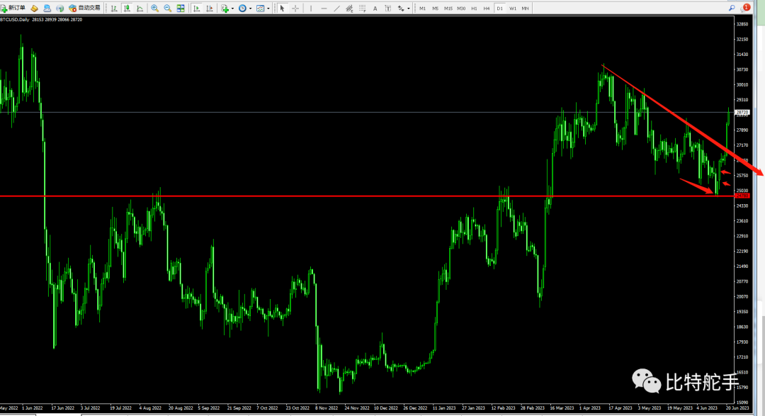 日线大趋势回调,在24800,这个我们前期多次提及的价格得到了转势。我们目前仍然持有25000 25500 26400 甚至27400的多单。这一波从开始到现在,所有文章和直播都见证了,我们是如何驾驭市场的。