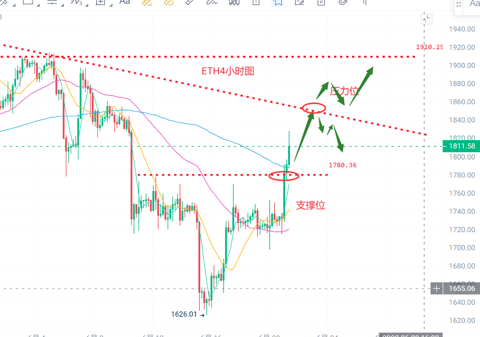 以太坊昨日高点1796附近,低点1714附近,以太昨晚虽然联动大饼走出拉升,但上升力度不是很大,并没有突破日线下降趋势线,目前已经有效站上1780上方,短线处于多头中。