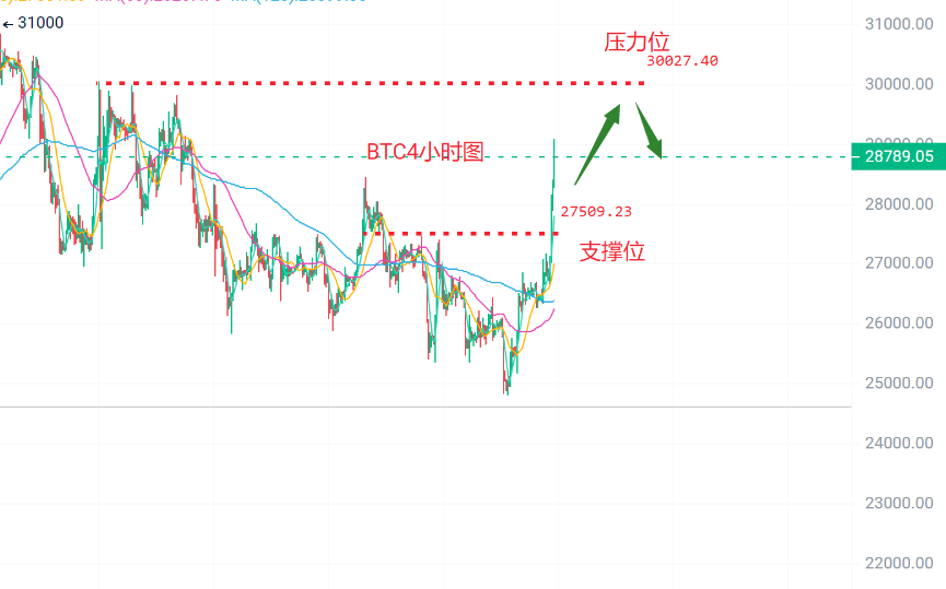 大饼昨日高点28400附近,低点26650附近。大饼在昨日日内走横盘调整,到了晚间开始走震荡上行,直接突破短线压力27500一线,最高触及29100附近后开始回落,昨天浮竹也说过若有效站上27500上方,行情可能开始反转。从目前来看直接放量突破日线级别下降趋势线,基本确定已经进入多头中。