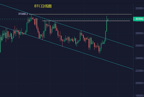 比特币,以为30000关口作为三重顶会有所压制,没想到不但没有压制,反而进一步推动币价直接冲高30800上方逼近新高31000关口,这也验证了金融市场的一句话,牛市不言顶,当然目前算不上牛市,只能说是正在进行一个阶段的强势上涨,但是正式因为强势,所以阻力位的压制作用就不太大,如果是在弱势行情当中,阻力位的压制效果就会更加明显。回到走势,昨日我们强调日线有要去测试30000关口的意思,果不其然币价不仅完美突破30000关口,甚至一度逼近新高,日线在突破下行趋势线压制后就已经形成破位,破位的延续也符合预期,不过日线指标上有调整的可能性,所以个人认为这波反弹的阻力位会在31000关口附近,日线短期可能会有所调整,不会继续延续当前强势,当然调整并不意味着就要开始转跌,从整体走势来看,趋势转变不会太快,顶底转换也需要时间周期,所以短线上我们保持看涨的同时,需要警惕日线级别的调整,不要选择高位追涨,或是高位震荡或是回调,回调支撑29000,至于本次单边反弹的高点暂时定为31000。