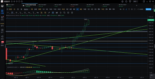 以太坊行情分析:自行情从1621附近反弹后,突破1775压制,而后开始上行的号角,周线方面有去冲击上轨2060中轨附近压制的趋势,而要顺利站上2000,需突破日线上轨的压制,昨天日线收大阳线,行情有冲击上轨1940附近压制的趋势,前几天长路在文中和视频都提到有走出底部模型,4小时头肩底,日线三浪反转上升浪,只走出了2浪的态势,若能顺利突破上轨的压制,那么将有机会继续上行。