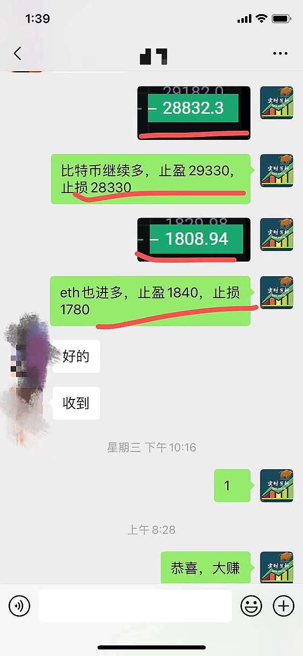 恭喜这几天小神给的多单非常给力,全部都止赢了,比特币止赢1000点,以太坊止赢60个点,欢迎新朋友一起加入!如图: