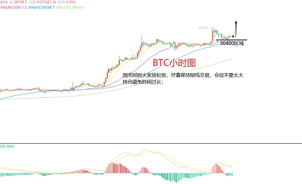 6月24日比特币(BTC)合约技术面分析:今日方面,大周期日线级别昨日报收小阳线,K线形态上连阳上涨,附图指标金叉运行,高点位置31500区域附近;那么还是前面讲过的,再顺势做多的情况下,还是需要防回撤修正的,因为价格目前是偏离了均线的;短周期小时图昨日美盘时间价格上涨,这也是最近的规律,日内基本趴着不动,晚间美盘或者凌晨会有一波走势,但今天周末,我们就不去奢求破位的走势,区间高点31500区域,低点30000区域;因此今日BTC短线合约交易策略:回撤30400区域多,止损30000区域,目标看31000-31300区域;