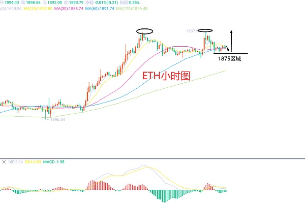 6月24日以太坊(ETH)合约技术面分析:今日方面,大周期日线级别昨日报收小阳线,价格运行于均线上方,附图指标金叉向上,K线形态上连阳上涨,那么趋势上是很明显的上涨走势,至于说很多朋友都在问,能到哪里,这个只能是一步步往上看了;短周期小时图前一日价格在美盘时间上涨高点位置1938区域,低点位置1860区域,当前价格承压回撤,那么还是不破不立的原则,看延续上涨前一日的低点位置不能怕,因此今日ETH短线合约交易策略:回撤1875区域多,止损1860区域,目标看1905-1920区域