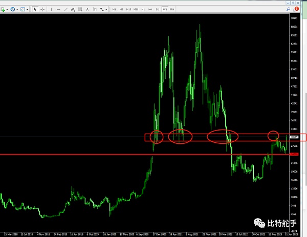 6月15日开始,大饼触底24800开启一波单边上涨的反弹。截止目前单边反弹延续了8个交易日。盘中遇鲍威尔听证会对于加息可能增加一到两次的刺激,币价直接冲破三万,市场情绪高涨,价格一度冲破3月12日突破大阳以来,连续13周的横盘震荡蓄势。如下图,端午节本周单周直接一阳吞并前期连续3个月的横盘价格区间。持续关注文章的朋友应该可以关注到,我们在大涨前期一直有提示27000之下任何价格随便做多。现货或者合约都有提示。27000之下我们从未建议过空头策略。价格如期甚至超预期的迎来了这波大阳的突破。