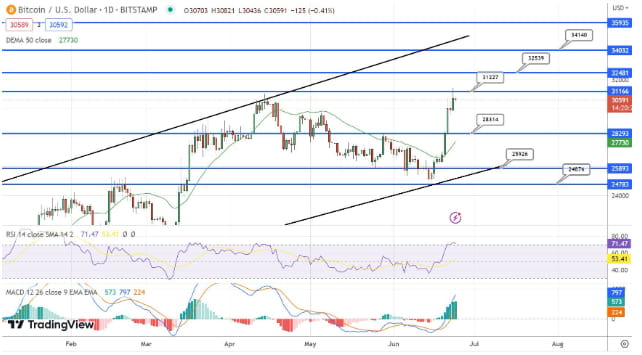 从日线图来看,比特币短暂突破了 30,700 美元的水平,并达到了 31,500 美元左右的高点。