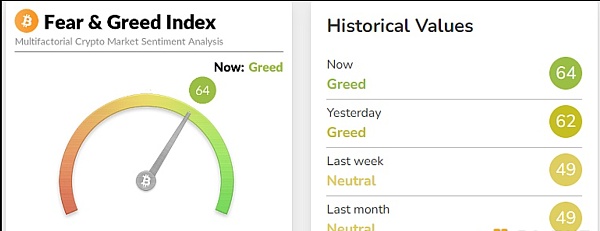 今日恐慌与贪婪指数为64(昨日为62),等级为贪婪。注:恐慌指数阈值为0-100,包含指标:波动性(25%)+市场交易量(25%)+社交媒体热度(15%)+市场调查(15%)+比特币在整个市场中的比例(10%)+谷歌热词分析(10%)。