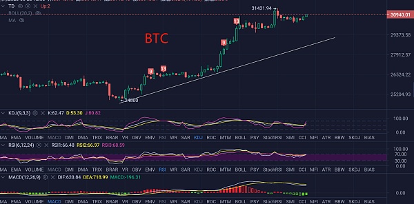 大饼昨日高点30800附近,低点30250附近。大饼在消息面的影响下,走了一波拉升,直接突破30000关口,最高触及31430附近后开始回落走震荡调整 。日线级别来看,假期期间日线收取带上影线的大阳。多头强势毋庸置疑,此轮冲高最高触及31500附近,自本周走高以来,属于非常明显的单边趋势。前期经历过近两个月的回撤,一周时间直接强势突破刷新高点,既然行情已经突破前高压制,那么这波上涨还没有结束,从目前来看,日线级别最近的压力位在34000一线附近,这里或将是大饼突破后下一个将要到达的高点。而且日线上狄马克TD指标反转九信号出现,所以日内操作等行情回调后继续参与多头。