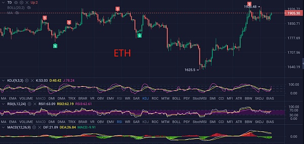 以太前期多次冲高都在1930一线遇阻回落,目前这里的阻力非常明显,此位置也是前期测试的高点,后市有很大的几率将迎来一轮补涨需求,但它的涨幅还是不够理想,没有大哥的走势那么强势。目前行情来看当前有较为明显的抛压阻力,现在的走势正在形成一个新的箱体结构,箱体操作高空低多,但是现在还是建议低多入场。