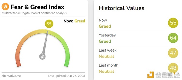 今日恐慌与贪婪指数为55(昨日为64),等级为贪婪。注:恐慌指数阈值为0-100,包含指标:波动性(25%)+市场交易量(25%)+社交媒体热度(15%)+市场调查(15%)+比特币在整个市场中的比例(10%)+谷歌热词分析(10%)。
