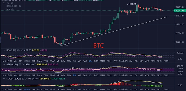 小周期一小时级别上看比特币今天早间插针到30000下方测试前方筹码密集区后迅速收回,这种小幅度的回撤不要认为多头就开始结束了,在做趋势行情的时候尽量只参与一个方向所以短期跟随行情节奏,先看回落,在看反弹,进场点位已前低29500作为进场点位。以太行情目前已进入箱体底部。