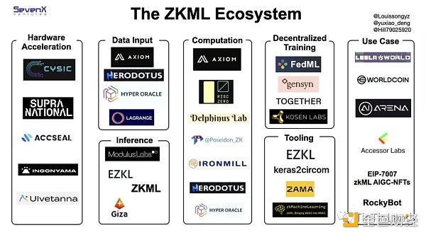 ZK 硬件加速:ML 的 ZK 证明较为复杂,这需要硬件辅助链上算力加速证明计算。这类项目包括:Cysic、Ulvetanna、Ingonyama、Supranational、Accseal。