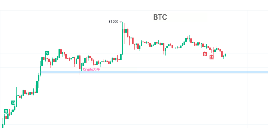 比特币今天的观点和昨天文中讲到的多头观点一致不做调整,方向看多头并不意味着行情会直接上涨,它可能向下调整再上涨。只不过我们交易参与的方向主要是多头。日线级别上昨天提示大家要堤防狄马克TD指标反转九的出现,行情午间抽高一波后随后也开始颓势。