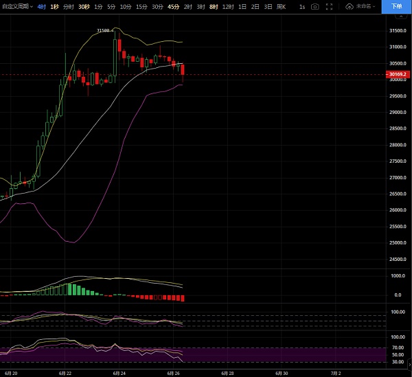 昨日凌晨大饼回到30200附近后,开始反弹,昨日午间再次突破31000位,但并未停留再次回调,今日凌晨再次打回原点,回到30200附近,数据看大饼在每次冲高后回落不断下探低点比特币以太坊自昨日午后开始在上方受阻回落,在连续上行以后,技术回落也是预期之内,虽然持续出现下跌动作,但是在下方触底便开始了反弹,这也意味着回踩行情并不是反转。随着大饼顶破30000关口,行情已经有意无意的透露着牛的身影,在此不得不说波段,中线又会迎来一波热潮,新的一周,让时间来造成梦想。废话不多说了,咱们看看今日盘面走势情况。