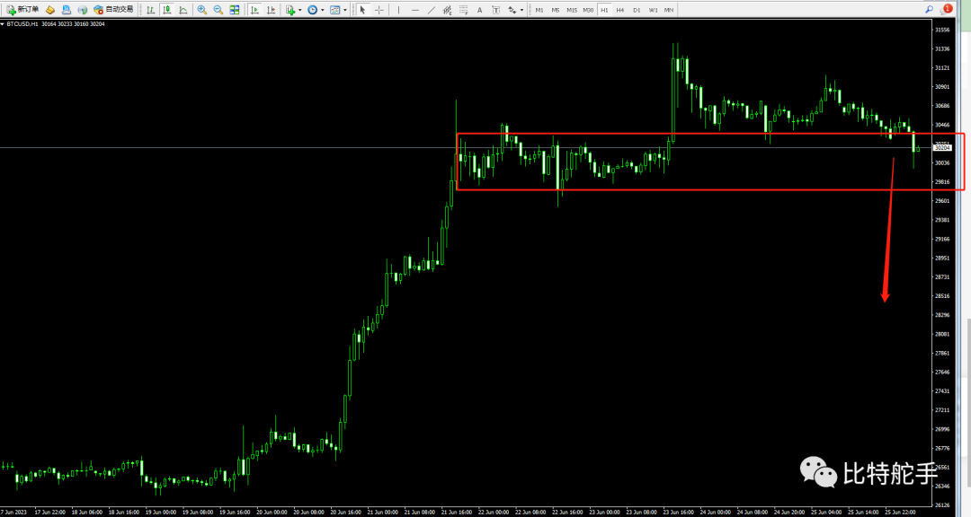 周末2个交易日价格都在一个单边慢跌之中,从我们前面提示在31000之上止盈27000以下所有抄底多单以来,价格几乎从我们反手的最高价格31222一路慢跌。如图小时图。目前价格是有破位最后一次加速拉涨大阳线的起涨价格的。现价30200,短线价格来到了最后一次加速上涨的横盘交易密集区。也就是图中框框内。这里料将还有短暂的墨迹。但是墨迹不墨迹这个不是关键,关键点是短线后市还有继续的下跌。早盘朋友们问的最多的都是,需要止盈吗?需要吗?需要么?