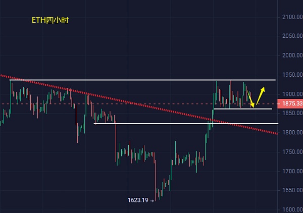 以太坊,好大哥都已经刷新高,但以太坊只完成了第一阶段的反弹,为什么说是第一阶段,自价格今年见顶2165下跌以来,整体下跌结构中有三个承压起跌点,2165-2025-1935,而1935刚好是这轮日线反转的转换位,上周首次反弹触及此位置后,币价在短短几个交易日多次承压,日线也进入阴阳交替循环的震荡调整模式,并且在反弹收阳的交易日当中,价格都是冲高1935一线明显回落并报收上影阳线,所以可以看出当前日线想要步入下一个上涨阶段,突破企稳1935是前提且必备的条件,短期震荡区间锁定1860-1935,关键支撑看1830,如果是继续保持箱体震荡,那么日内回踩箱体底部1860先多即可。
