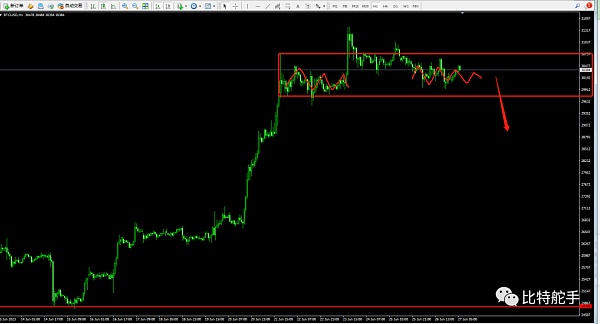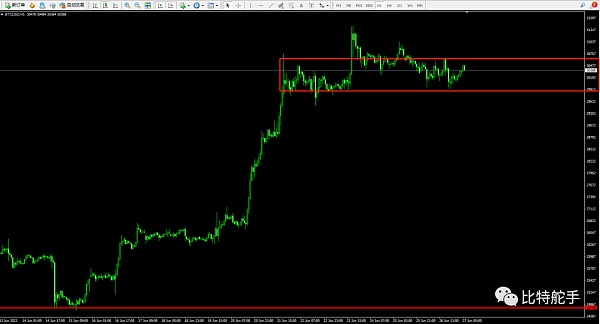 昨日市场较为清淡,整日波动区间在30600到29900区间,也就是我们强调过的一小时前面交易密集区的横盘墨迹。