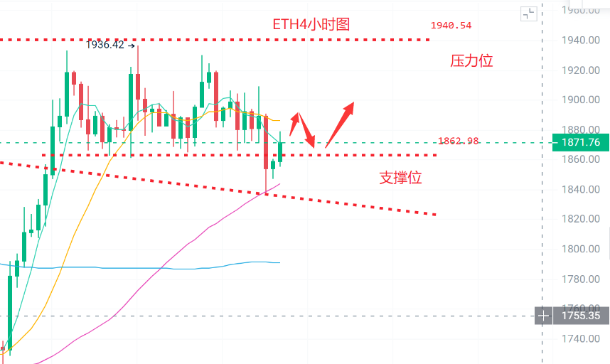 以太坊昨日高点1910附近,低点1837附近,以太在连续几日上攻1930未破后,在昨日晚间开始走了一波回落,直接跌破近期支撑1860一线,在触及前期下降趋势线后开始走反弹,目前重回1860上方,短期预计还将继续走震荡,上方关注1930-1940的压力,此位置一旦有效突破,后市将会迎来一波补涨需求。