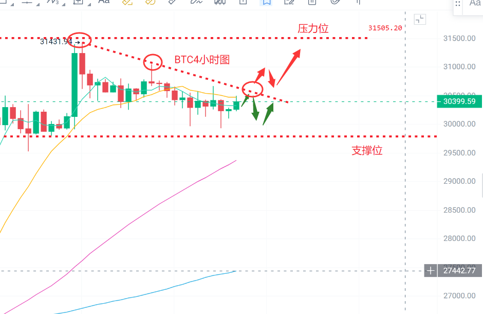 日线级别处于回落调整中,稳固后再次上攻的概率大,布林带依然处于开口状态,受布林上轨31800压制,MACD缩量下行,4小时级别处在下降三角形中,布林带仍然处在收敛口中,MCAD开始温和放量。操作上建议回踩29800不破轻仓做多,目标30500-30900,上攻31500不破轻仓做空,目标30900-30500,止损各350点。行情变化万千,具体操作以实时策略为主。