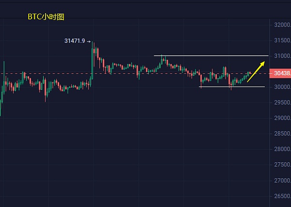 比特币,每一个阶段的行情走势都具备一定的规律性,例如现阶段的比特币和以太坊,每一轮短期的走势结束之后,都会通过一段较长周期的震荡来重新抉择下一轮走势的方向;这不经过上轮的上涨之后,双币再次展开震荡调整,比特币目前已经处于高位,日线暂时也企稳30000关口上方,但是31000关键阻力承压明显,不过从短线的回调力度来看,整体回调偏弱,也就意味着短期币价大概率还是会继续测试31000阻力,如果日线有效突破企稳接下来继续看涨即可。