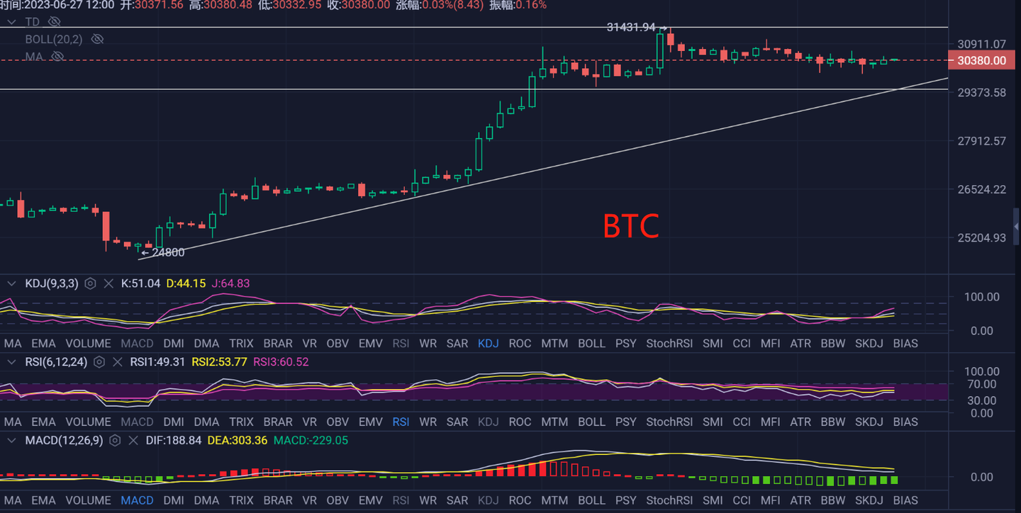 目前大饼在30400附近运行,四小时级别行情反弹高点降低,虽有所回落但力度不大,下方多次插针至起涨点附近都未曾有效跌破,短期空头缩减再次反弹试探ma14均线压制,日线级别首次回踩ma7均线未能破位收针,macd多头逐步缩量,整体走势偏向震荡回调,若破位ma7预计空头会加速下行,自从22号的30800来了一个假突破,虽然是一个比较强势的大阳线,但是没有有效的站上去,甚至还跌了回来,所以我们不能在这里确认它能延续之前的强势,毕竟涨了那么多天了,适当的调整也应该有。目前短期来看还是空单进场,下看到29300附近。