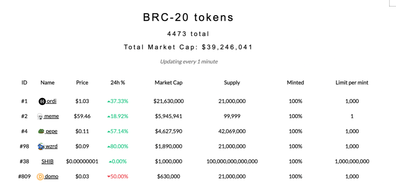 在 BRC-20 发布的24小时内,就有超过 30,000 个 ??????? ???????????? 被铸造。@Domodata 也部署了 BRC-20 的第一枚代币—— $Ordi,总量2100万个,每个人都可以免费Mint,在不到2天的时间里, $Ordi 就被全部mint完毕。