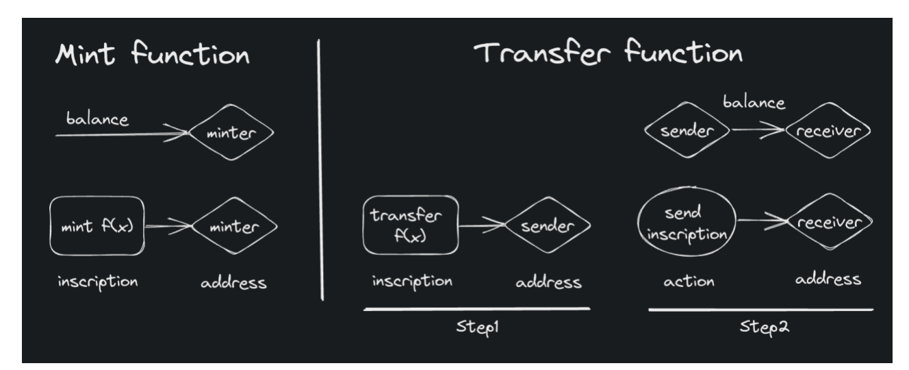 BRC-20 利用 JSON 数据的 ??????? ???????????? 来部署代币合约、铸造代币和转移代币。你可以把 BRC-20 标准当成Ordinals的一种应用类 NFT,相当于一张支票, BRC-20 没有智能合约。