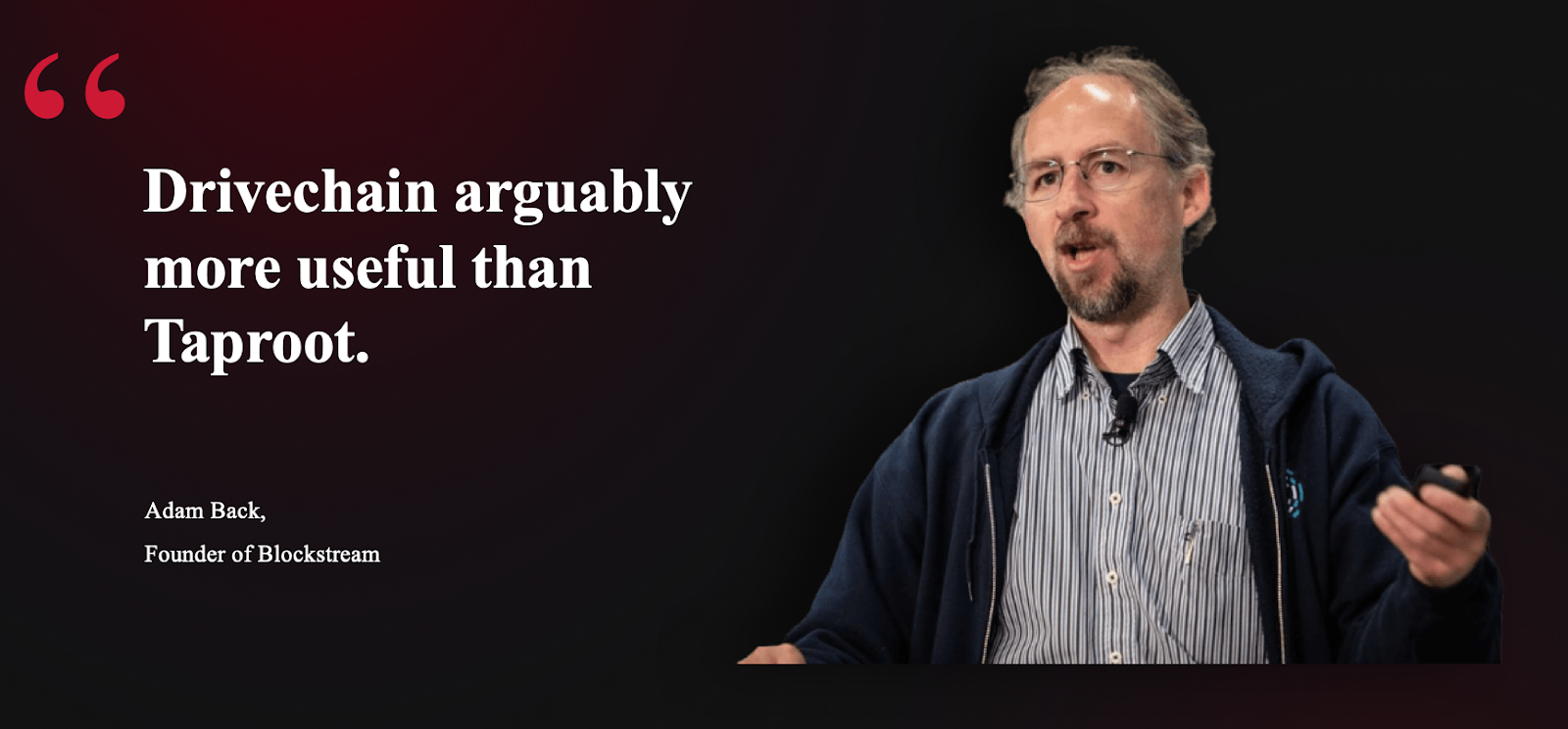 需要注意的是,比特币闪电网络仍然是一个相对新的技术,仍在不断发展和改进中。随着技术的成熟和采用的增加,一些缺点可能会得到解决或减轻。而 Blockstream 创始人 Adam Back 博士认为:Drivechain 可以说比 Taproot(一种用于Ordinal NFT 的 BTC Layer2 技术)更好。