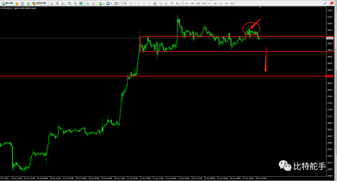 昨日比特币在连续三个交易日的慢跌之后,盘中冲高回落震荡。整日波幅800点。高点31000低点30200,整日波幅十分缓慢,接近美盘时段价格才出现快速的冲高,盘中我们果断再次提示了30700上下空头进场,以31200为止损的空头策略。波幅有限,利润空间也有限。