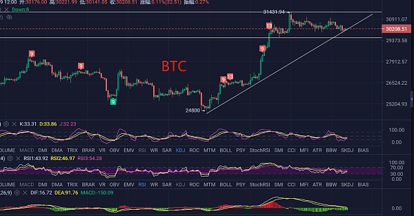 昨日大饼和以太整体走势相对来说还是比较弱势的,走了一个震荡下行的节奏,从早间大饼开盘最高30700一线,一路震荡下行跌至29800附近,随后快速反弹,目前币价有效企稳30000上方震荡修复运行。在凌晨大饼下跌试探了一下29800支撑位,随后开始反弹,虽然位破支撑,但是最近大饼表现出来的走势确实很弱,或许我们应该改变思路,但是我们想想在多次跌破30000下方后都能反弹上来,可见大饼已经是站稳30000的,只能说上涨前夕的一个震荡回调,个人认为在磨韭菜和主力的耐心,当我们抛之,行情必定会迎来新的突破。