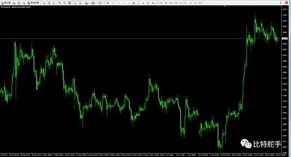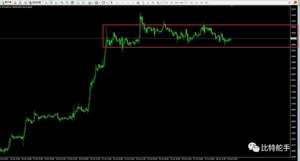 昨天日内虽然看好大阴线,日内确实也算是大阴线,但是这个大,似乎也不太大。毕竟就900点而已。最近7个交易日,大饼价格一直在这900点区间内震荡。既无大涨加速的迹象,也会在每次破位3万整数关口的时候,迅速再次站上。这样反复的拉锯, 反复的震荡。无所谓多空趋势,整个横盘震荡格局。
